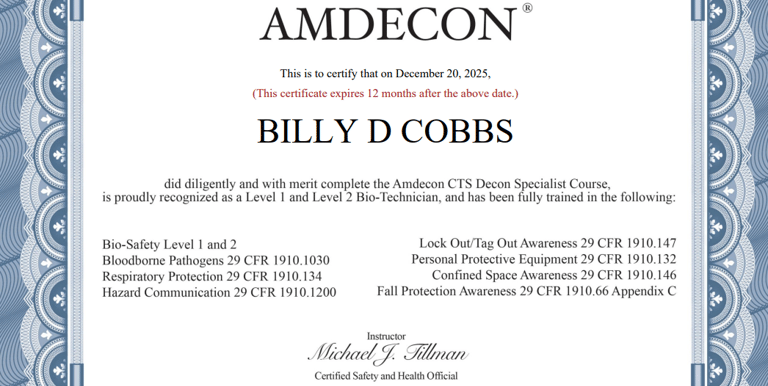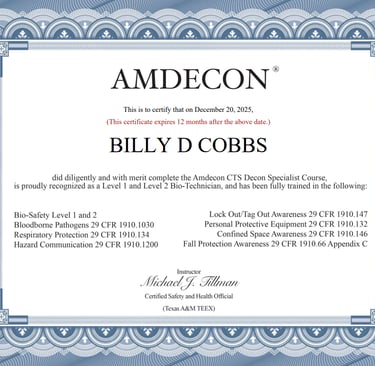 Trained in trauma-scene management, bloodborne pathogen control, and environmental decontamination through Amdecon and OSHA-approved programs. Skilled in contamination control, PPE use, and safe handling of biohazardous materials in both residential and commercial settings.